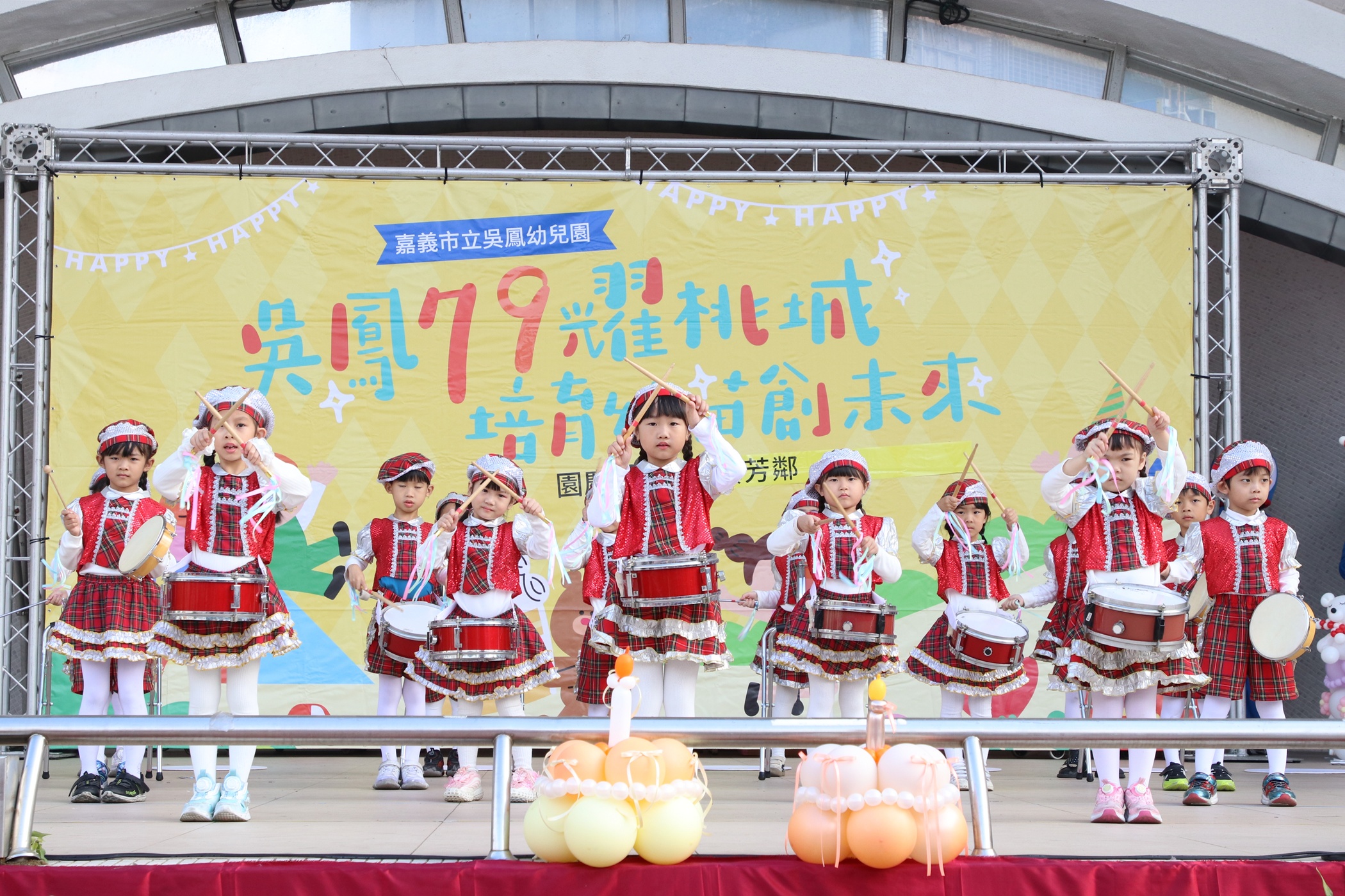 教育處郭添財處長指出,吳鳳幼兒園教學成果十分亮眼,除了在113年度獲得教育部教學卓越銀質獎,也在今年獲得本市培星計畫優等成績。而本次園慶活動一大亮點,是去年甫成立的「敲好聽鼓樂隊」,也是嘉義市首創由幼兒園孩子組成的鼓樂團隊,該鼓樂隊並同時結合社區音樂專業資源,孩子們去年也實際參與嘉義市第33屆國際管樂節踩街演出,落實「管樂之都」藝術教育向下扎根的政策方向。園慶當天,孩子們以《吳鳳79.歡樂久久》揭開序幕,透過節奏與律動展現學習成果,也培養幼兒自信參與公共舞台的能力。