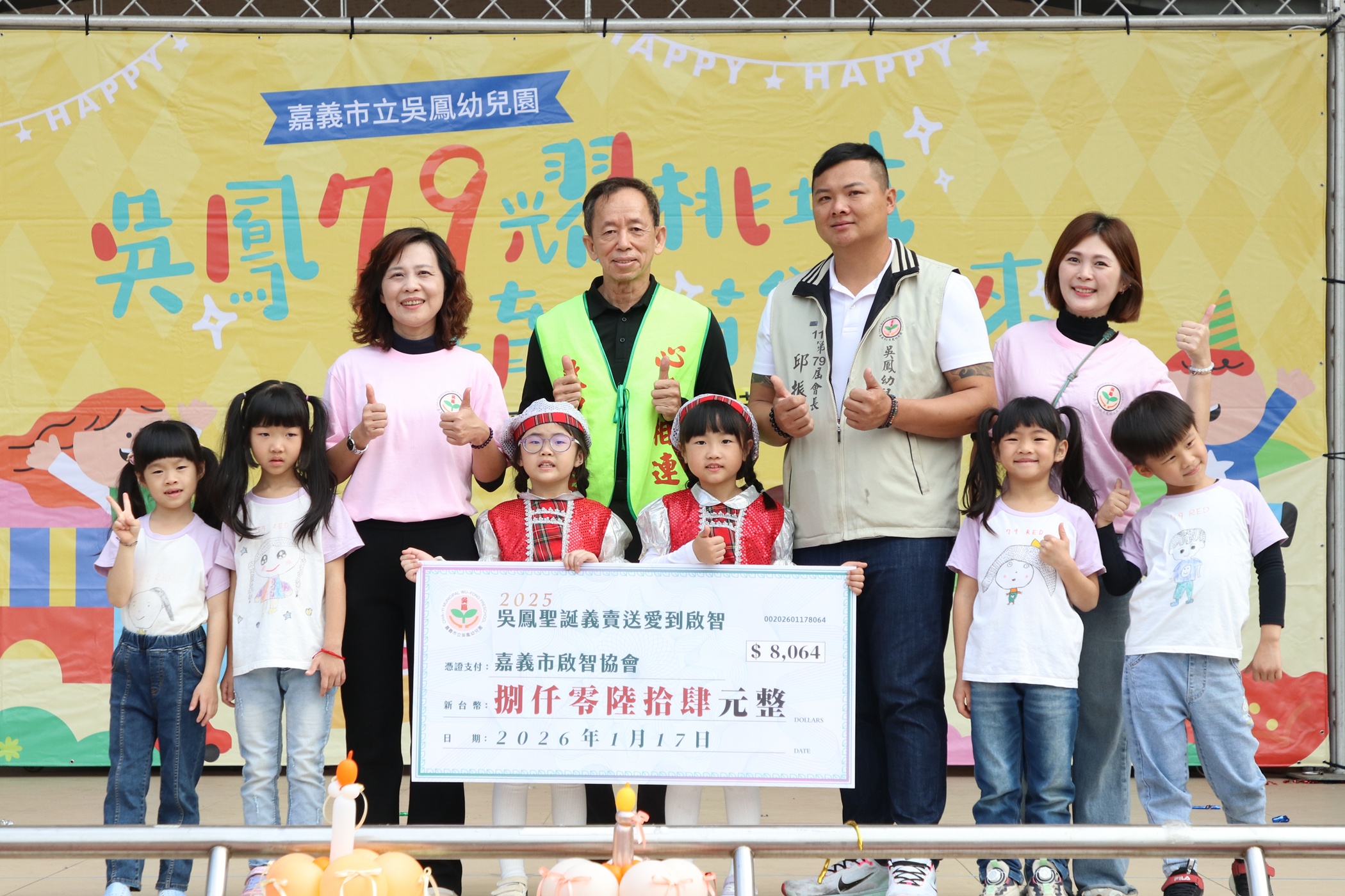 羅玉菱園長表示,除藝術教育外,吳鳳幼兒園亦長期推動稚齡童軍與小小女童軍課程,透過服務、利他與助人的行動學習,培養孩子的責任感與社會關懷。今年園慶更將全園親師生於聖誕節跳蚤市場義賣的部分收入,捐贈給「嘉義市啟智協會」,用愛及實際行動關懷他人,扎根共好理念。