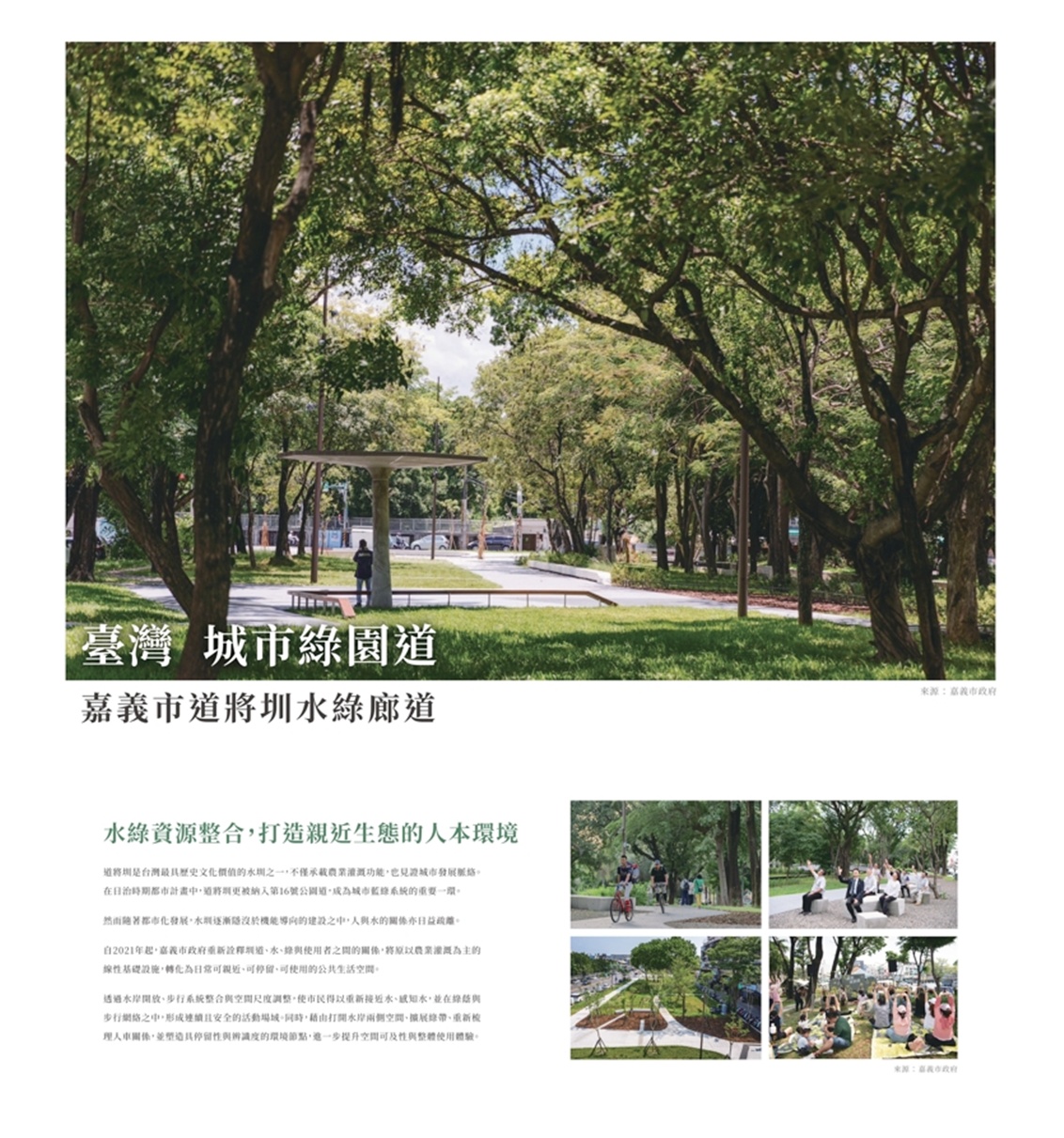 都市發展處指出,本次展覽回顧1943年都市規劃所提出「公園道串聯公園」的田園城市藍圖,展現嘉義市早期以綠意串聯都市空間的規劃理念,並分享國內外林蔭路廊與公園道的多元實踐案例,從嘉義市道將圳水綠廊道、臺中市綠園道,延伸至法國巴黎大軍團大道及西班牙巴塞隆納超級街區計畫等,讓市民了解現代的都市如何紓解人車衝突及拉近人與自然的距離。