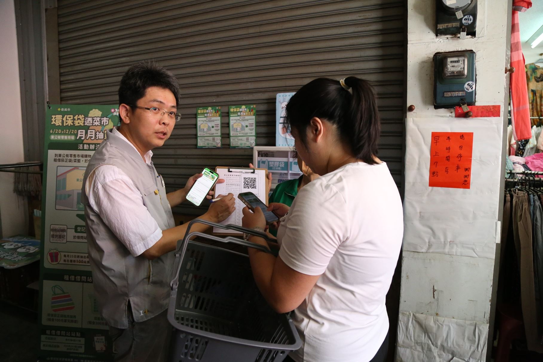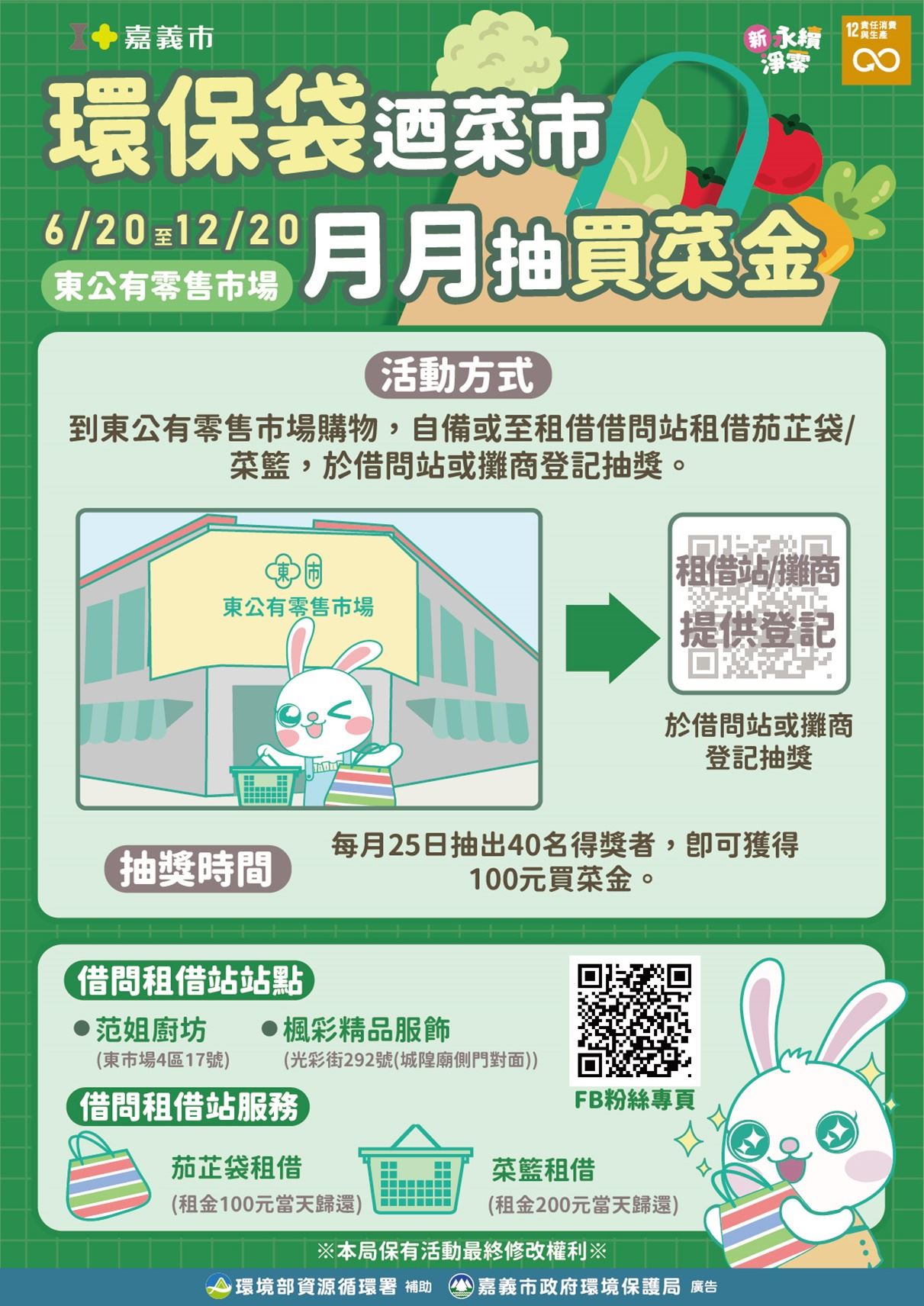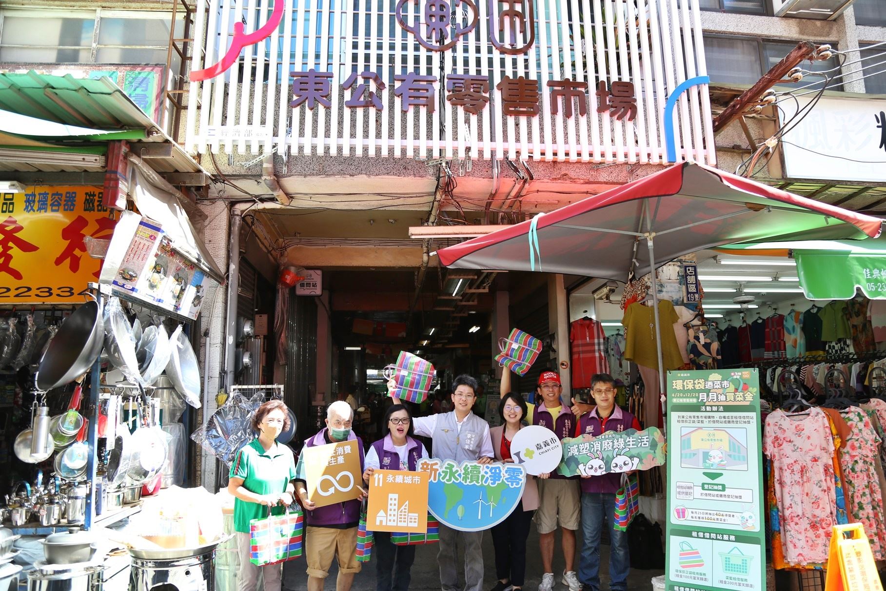 氣候變遷儼然成為全球永續發展的最大挑戰,為推廣低碳生活至市民響應,嘉義市「新永續淨零」以2050淨零碳排為目標,建構韌性海綿城市共創永續家園,市政府環境保護局與東公有零售市場共同舉辦「環保袋迺菜市·月月抽買菜金」活動,今(19)日環保局長李佳禾也代表黃敏惠市長出席活動,同時向市民朋友傳達減塑、再利用及永續發展概念,讓環保與市場匯聚一堂共同響應減塑行動。活動日期自113年6月20日起至113年12月20日止,凡自備購物袋購物或至東公有零售市場借問站點租借茄芷袋或菜籃購物,即可掃描QRcode登錄享抽獎資格,每月25日將抽出40名得獎者,每名得獎者皆能獲得價值100元買菜金,人人都有機會抽買菜金。