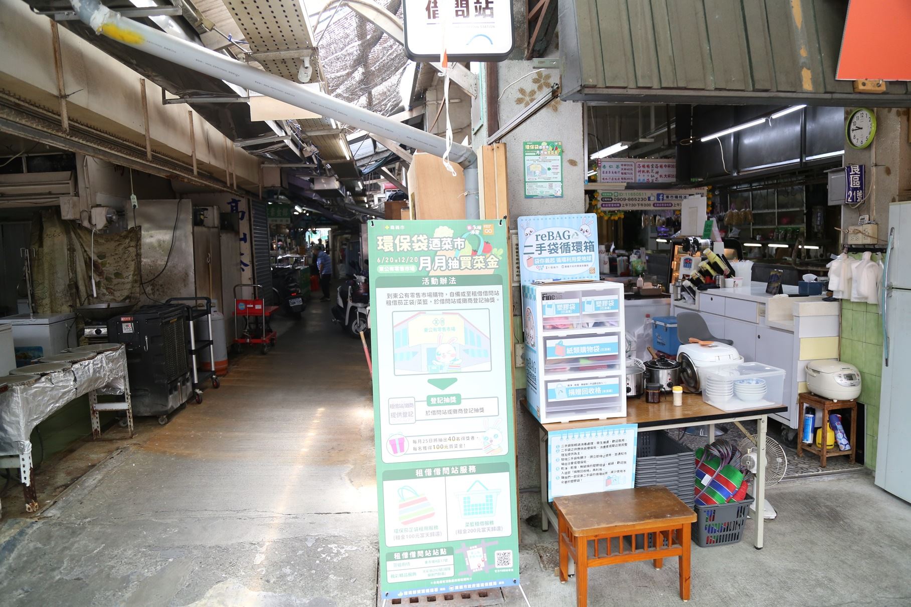 市府環境保護局表示,「環保袋迺菜市·月月抽買菜金」於東市場內借問站點設置兩處二手循環箱,民眾可以租借茄芷袋或菜籃購物,此外,也可將乾淨的一次用塑膠袋及紙袋放入箱內供循環再利用。透過預防、減量、回收及再利用,大幅減少一次用塑膠袋產生。通過這樣的宣導活動,讓市民對「減少塑膠依賴、消除廢棄物產生」有更深刻的認識,並融入在日常生活中一一實踐,一同邀請更多人投身參與其中。
