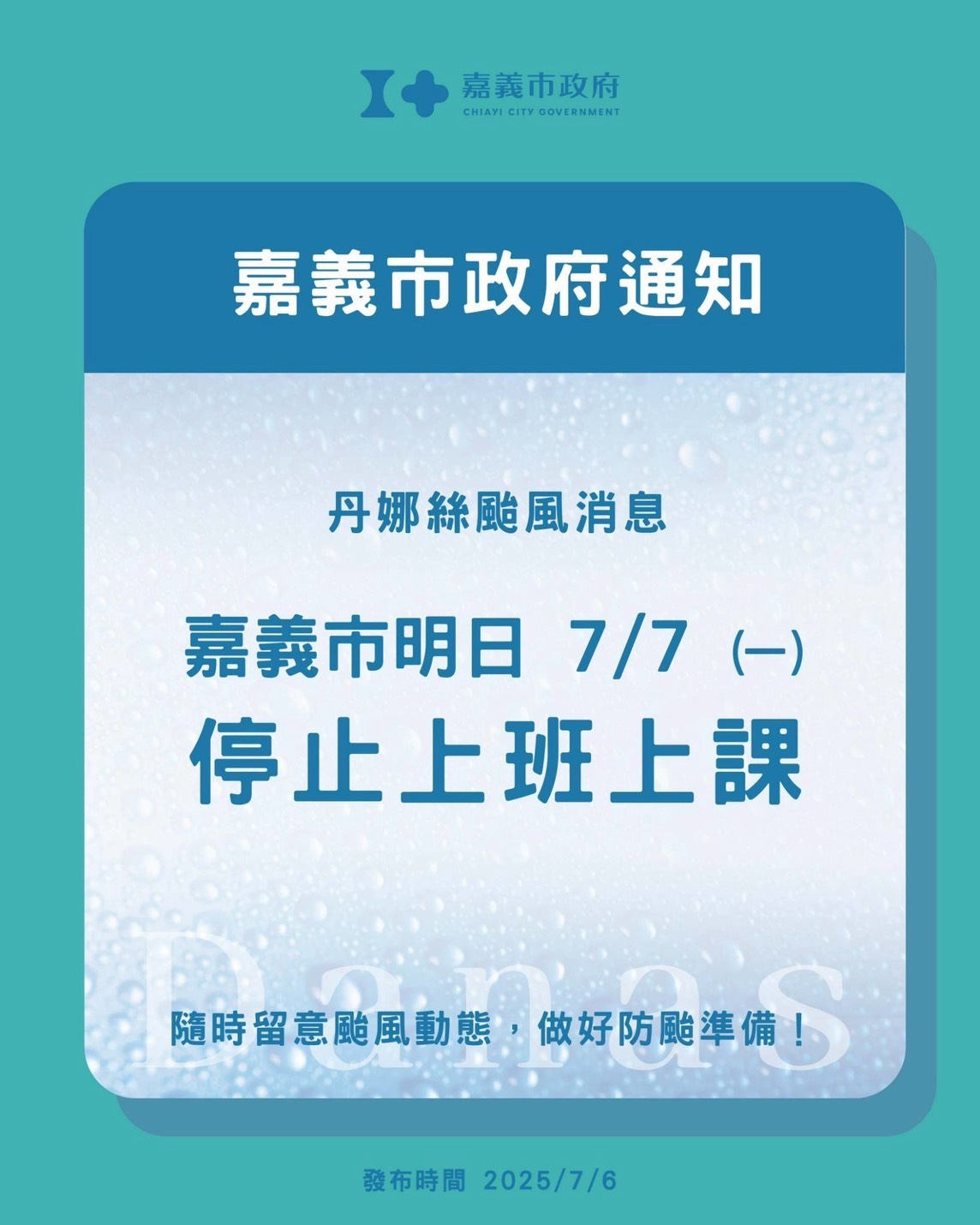 根據中央氣象署最新預報資訊,丹娜絲颱風暴風圈已進入臺灣南部地區,颱風強度有增強趨勢,明(7)日晨起嘉義市風力預測,平均風力達7-8級、最大陣風可達10-11級,已達停止上班上課之標準。 嘉義市政府宣布,明日(7月7日,星期一)本市停止上班、停止上課。籲請市民朋友嚴防強風豪雨,非必要請勿外出,並做好各項防颱準備措施,確保安全。