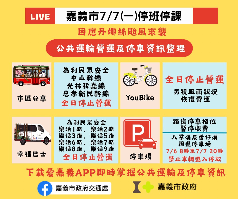 嘉義市政府宣布,明日(7月7日,星期一)本市停止上班、停止上課。籲請市民朋友嚴防強風豪雨,非必要請勿外出,並做好各項防颱準備措施,確保安全。