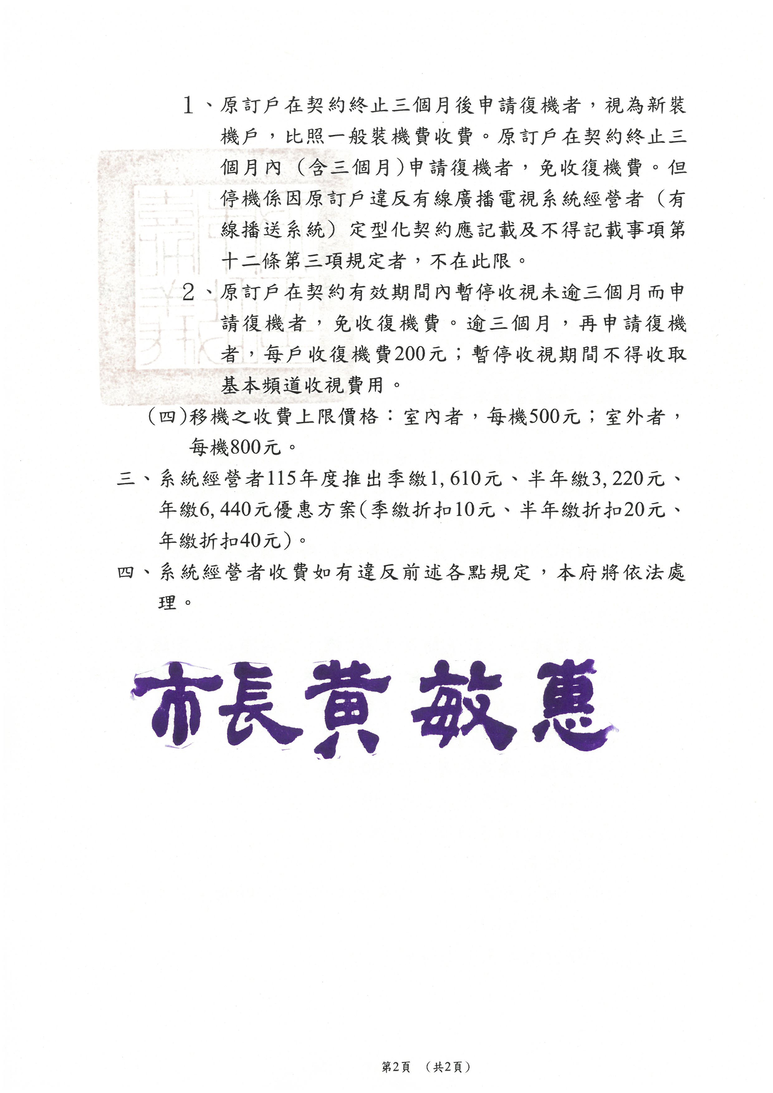 一、嘉義市政府 (以下簡稱本府)依「嘉義市政府有線廣播電視系統費率審議委員會」審議結果,核准本市旨揭有線廣播電視系統經營者 (以下簡稱系統經營者) 115年度基本頻道收視費用如下: