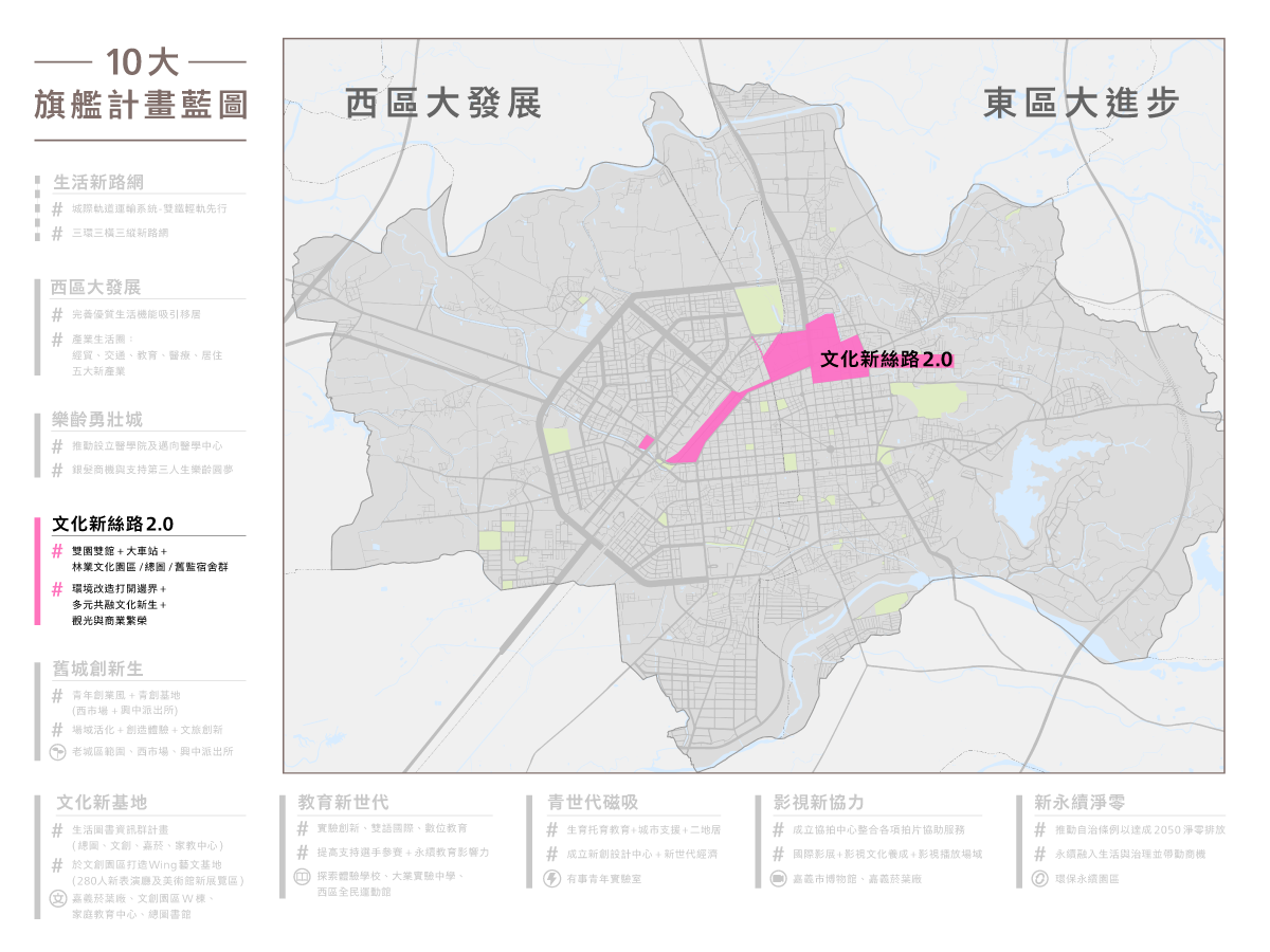 因應鐵路高架化,將嘉義車站營造為大車站門戶意象軸心,向西串聯雙園(友忠公園、番仔溝公園)雙館(美術館、文創園區Wing藝文基地),向東連結文藝森粼(林業文化園區、總圖書館、舊監宿舍群),透過環境改造打開邊界,以多元共融再造文化新生,促使城區觀光與商業繁榮。