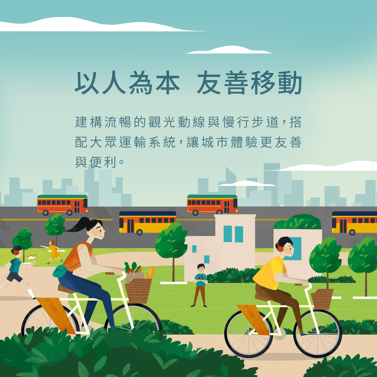 亮點三:以人為本,友善移動 人本觀光道路:提升步行以及自行車道的連續性,以人為本規劃慢行友善的觀光動線。 大眾運輸:搭配公共運輸系統,改善現有交通狀況,串連城市各個角落之文化觀光景點。