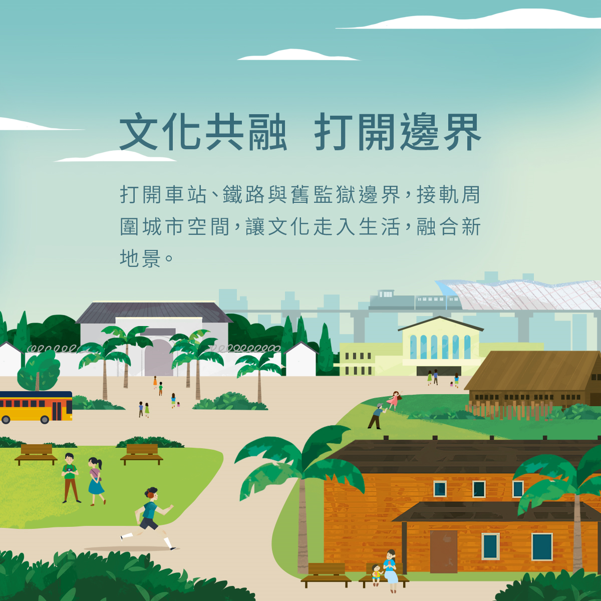 亮點二:文化共融,打開邊界 大車站計畫:塑造嘉義車站新意象,整頓站前廣告招牌等市容,打造乾淨美觀之候車亭空間,創造提供舒適步行走道,並將車站舊建築轉用,成為市定古蹟。 森鐵文化串連:弱化鐵路車庫園區邊界,接軌城市空間,將林業文化歷史結合。 舊監獄景觀營造:嘉義舊監獄周邊環境整修及周邊人行環境營造,豐富宿舍群生活樣貌,打造地方創生基地。