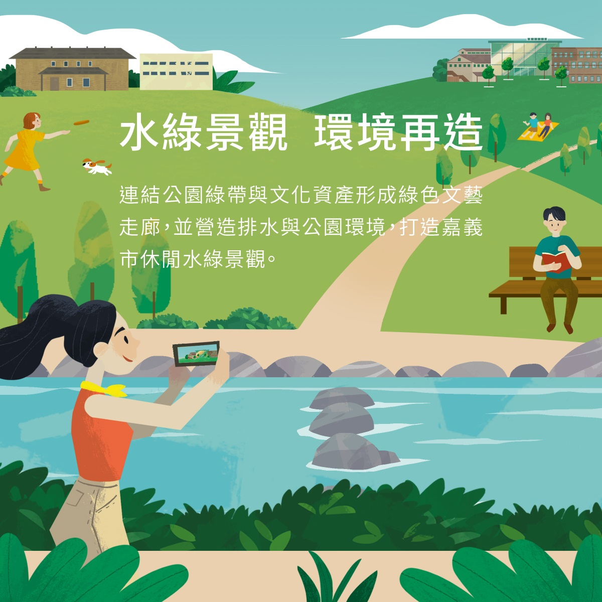 亮點一:水綠景觀,環境再造 文藝綠廊道:番仔溝公園及友忠公園綠帶連結,串連嘉義文化創意產業園區及嘉義市立美術館形成綠色文藝走廊。 都市休憩場:北排水主幹線與維新支線水質改善與水岸營造,串連北香湖公園、嘉義公園至蘭潭,並活化嘉義大學林森校區整體空間,打造大型都市休憩場域。
