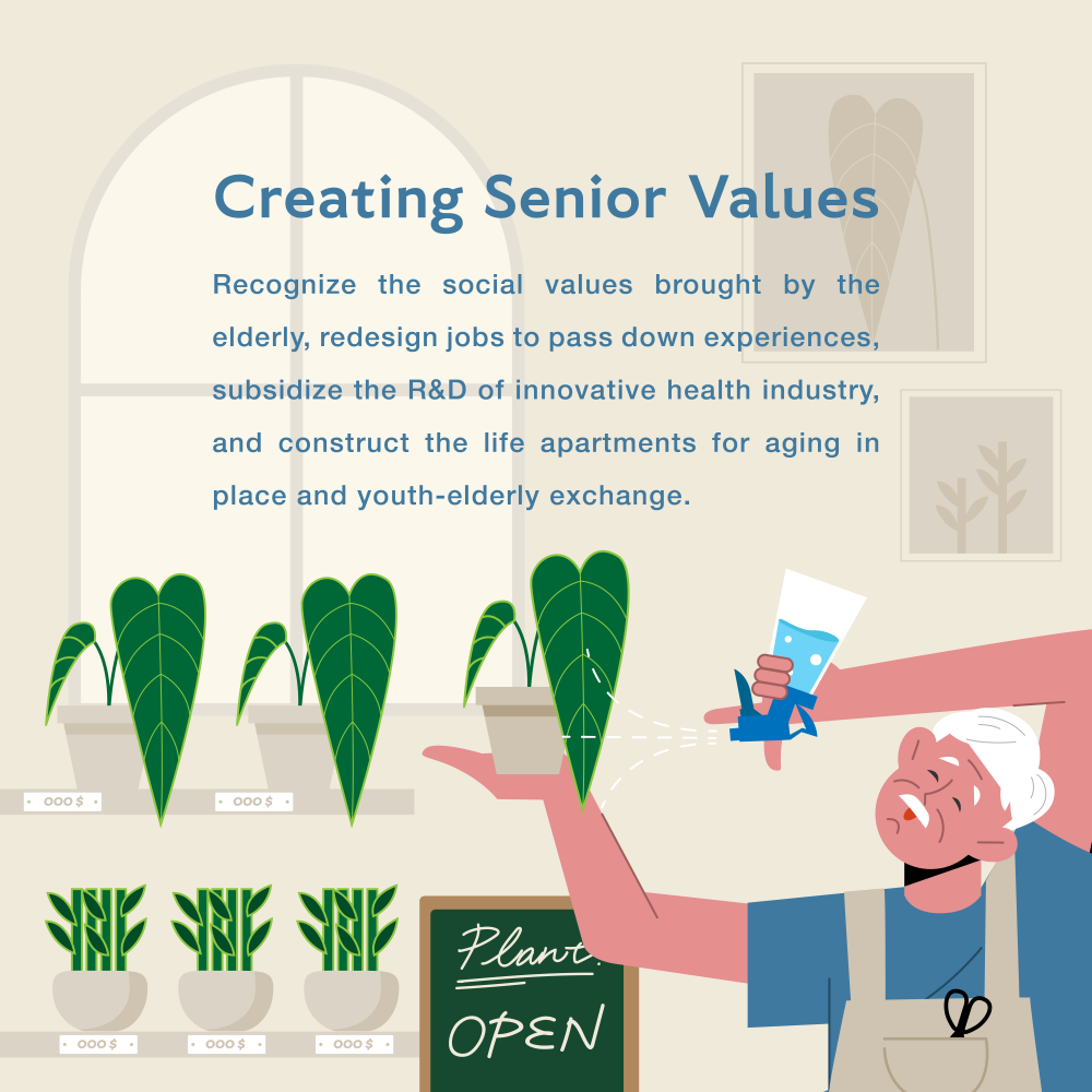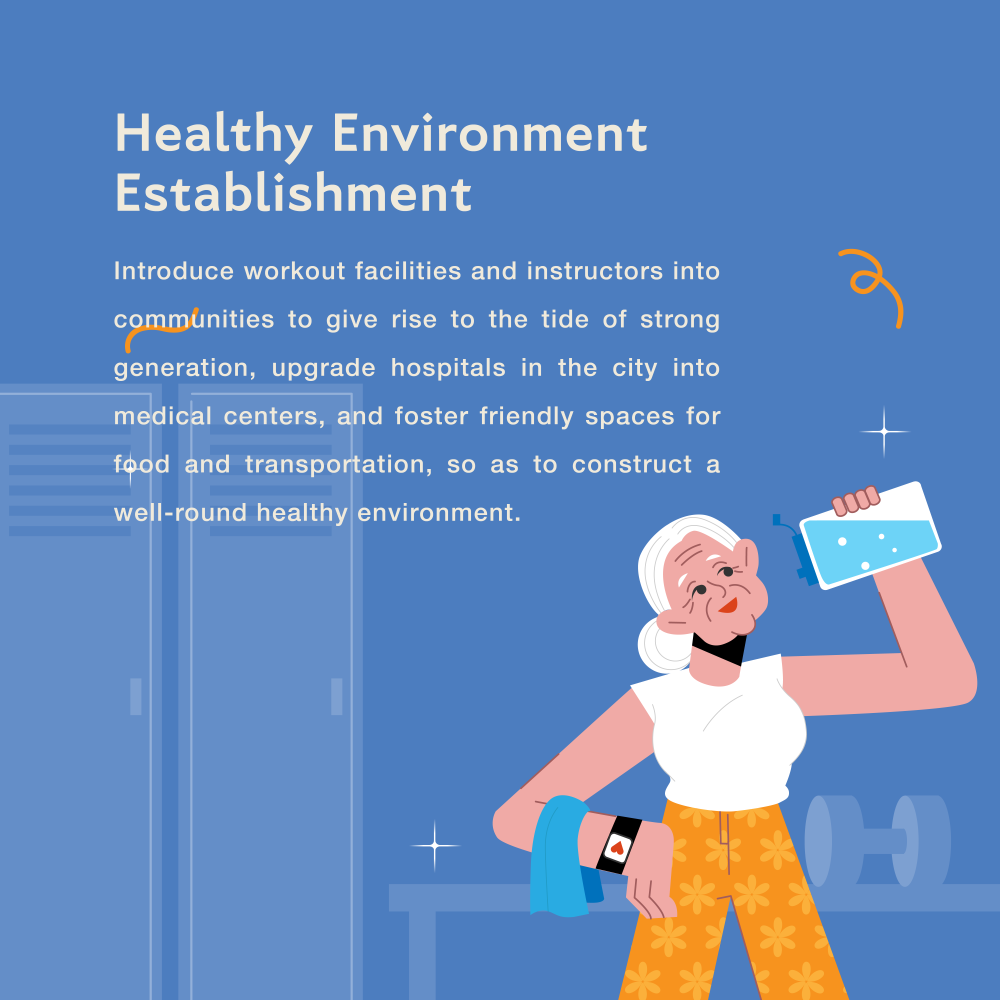 Sports accessibility in every corner: Introducing workout instructors and facilities into parks and certain spots for the accessibility of the elderly. Integrating health management to provide exercise patterns suitable for the elderly. Setting up multiple senior training grounds, and creating senior fitness clubs.